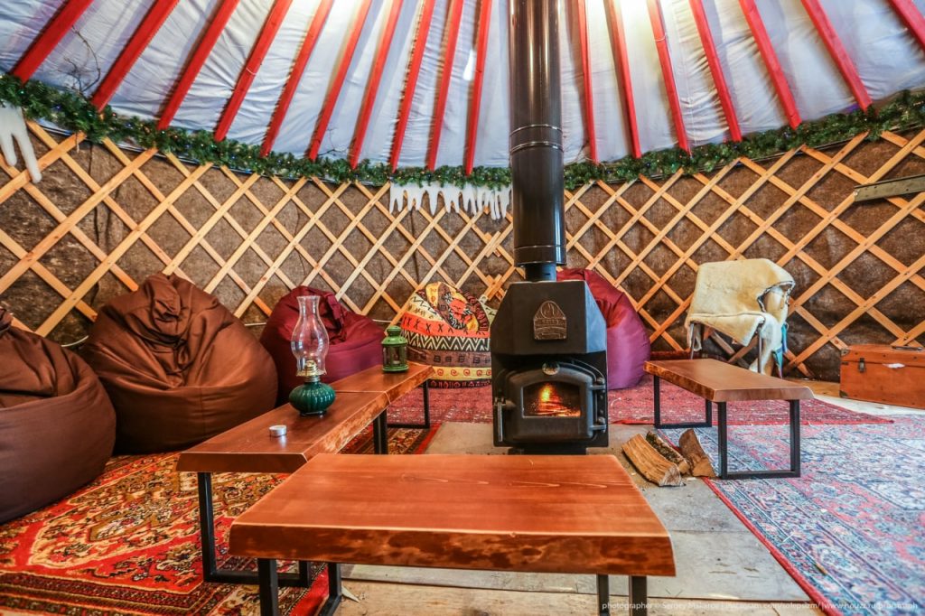 Юрта тут тёплая, просторная и чувствуется как отдельный маленький мир: мягкий рассеянный свет, толстые войлочные стены, стабильное тепло без перепадов. Зимой внутри сухо и уютно, можно спокойно сидеть часами — от камерных посиделок до небольших встреч.