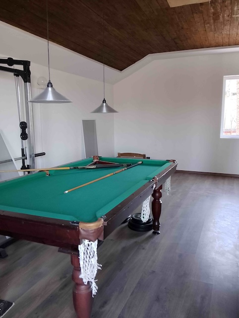 Территория — 1 га. Пространство полностью закрытое и спокойное, без случайных гостей и соседей. На участке — баня на дровах в отдельном двухэтажном доме: внизу находится парная, кухня, бар и санузел, а наверху — антресоль с зоной отдыха и бильярдом. Формат удобный: шумная компания может зависнуть на втором уровне, пока остальные парятся или готовят что-то внизу.