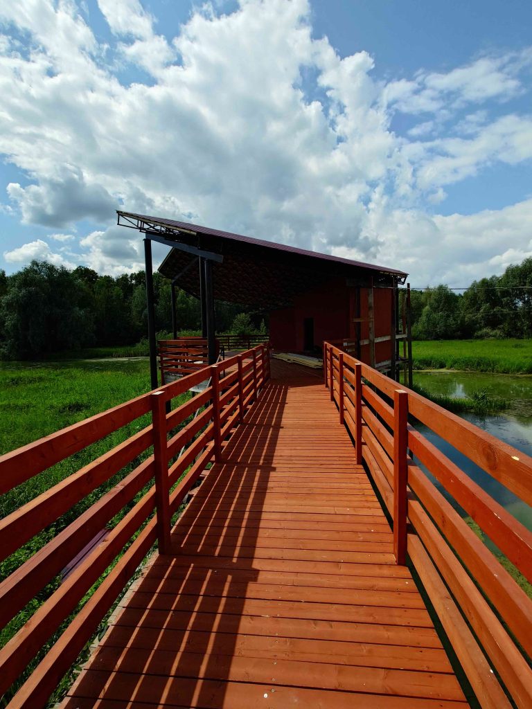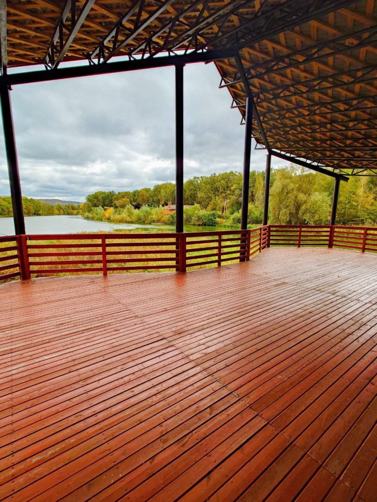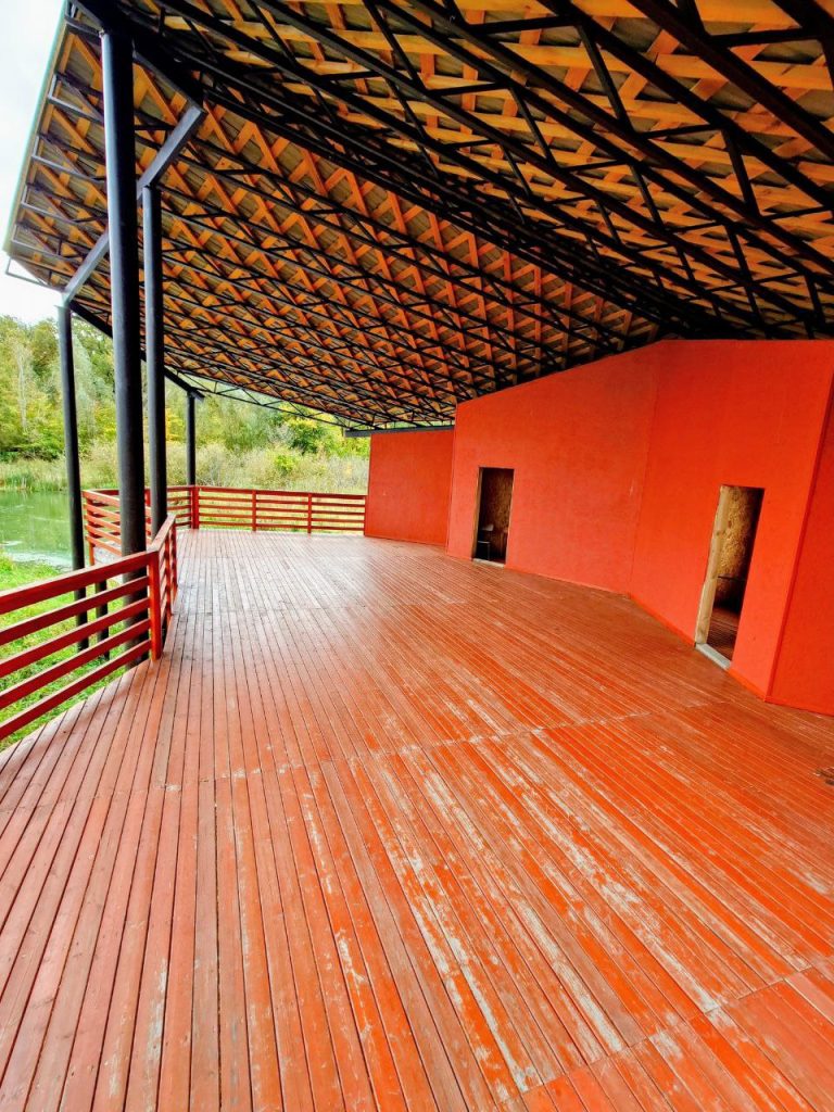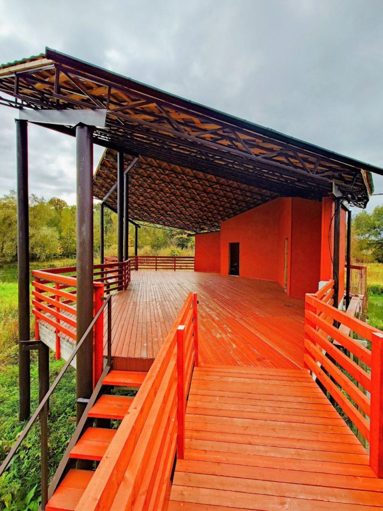 С мостика, ведущего к веранде, открывается живописный вид на озеро и лес, а сама веранда находится на высоте трёх метров от земли. С воздуха она напоминает сердце — символ любви и праздника. Вечером пространство оживает мягким светом гирлянд, создавая атмосферу уюта и романтики.