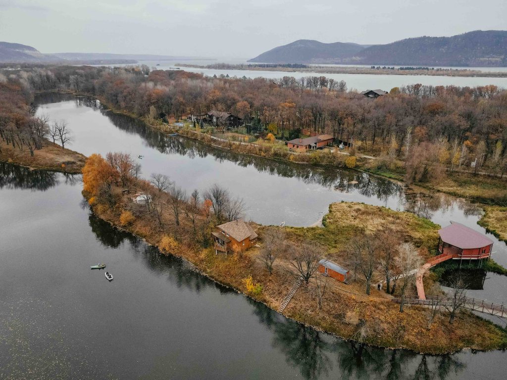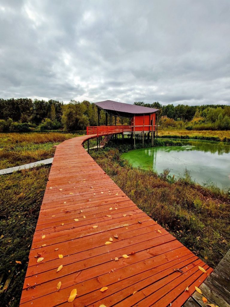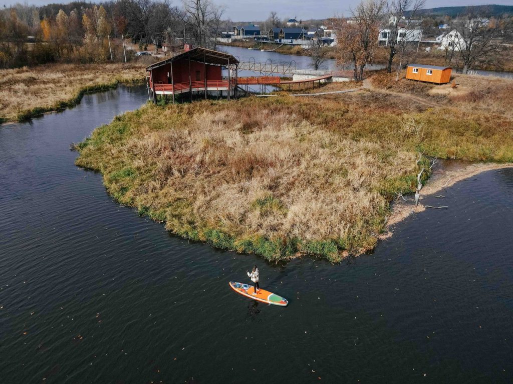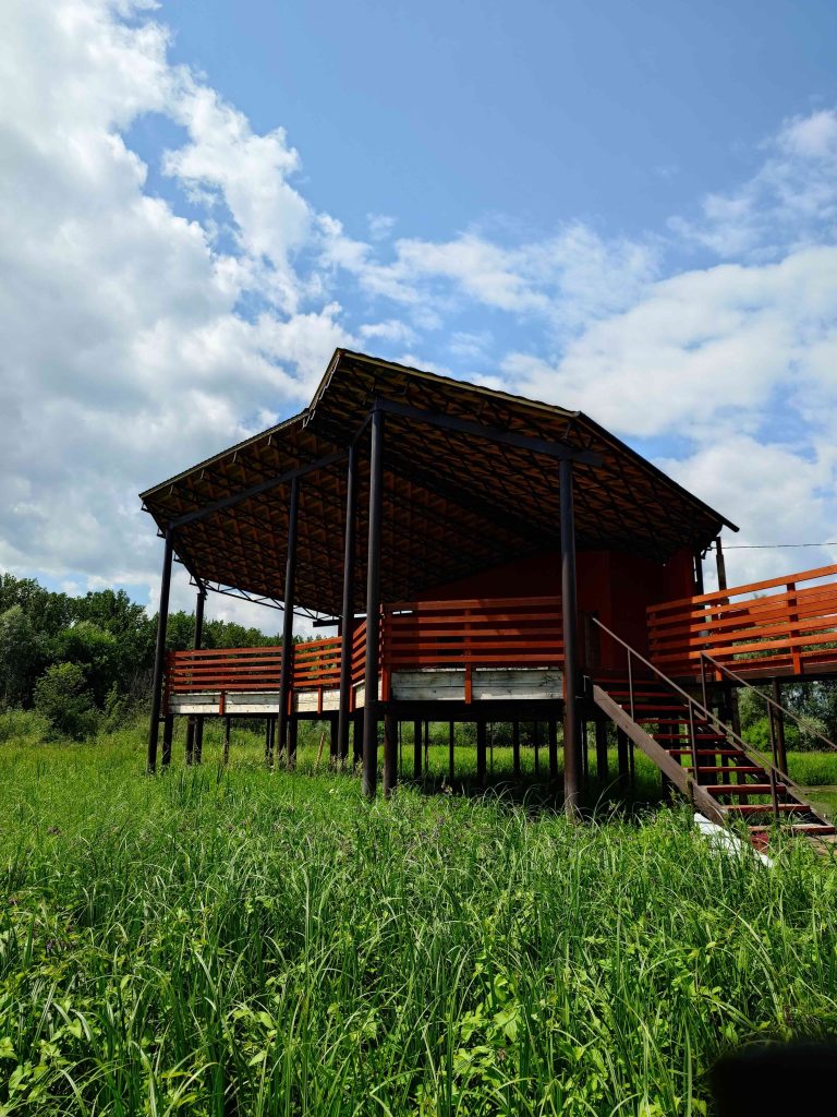 С мостика, ведущего к веранде, открывается живописный вид на озеро и лес, а сама веранда находится на высоте трёх метров от земли. С воздуха она напоминает сердце — символ любви и праздника. Вечером пространство оживает мягким светом гирлянд, создавая атмосферу уюта и романтики.